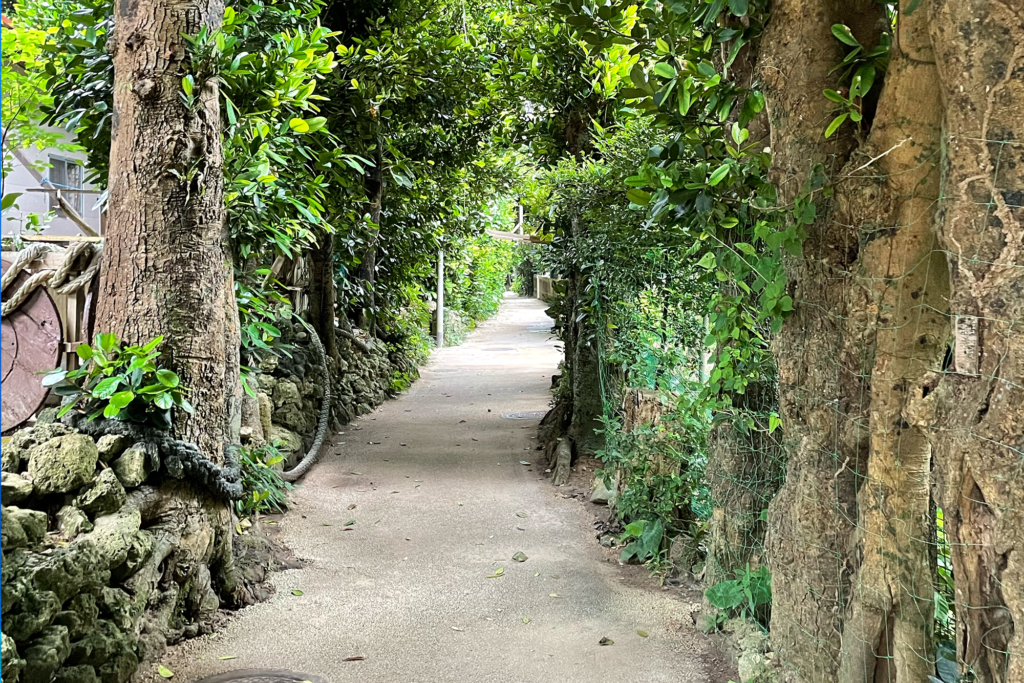 約2万本のフクギが生い茂るおよそ1kmの並木道は、強い日差しを遮る緑のトンネルとなり、散策にぴったりの場所です。フクギの間から見える赤瓦の古民家が風情を感じさせ、どこを切り取っても絵になる景色が広がります。
