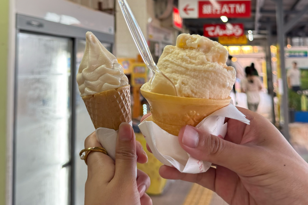 沖縄限定のお土産や特産品が揃い、ローカルグルメも楽しめます。特に、「琉球銘菓 三矢」のサーターアンダギーと、沖縄北部でしか食べられない「おっぱ乳業」の「おっぱソフト」は至高のグルメです。